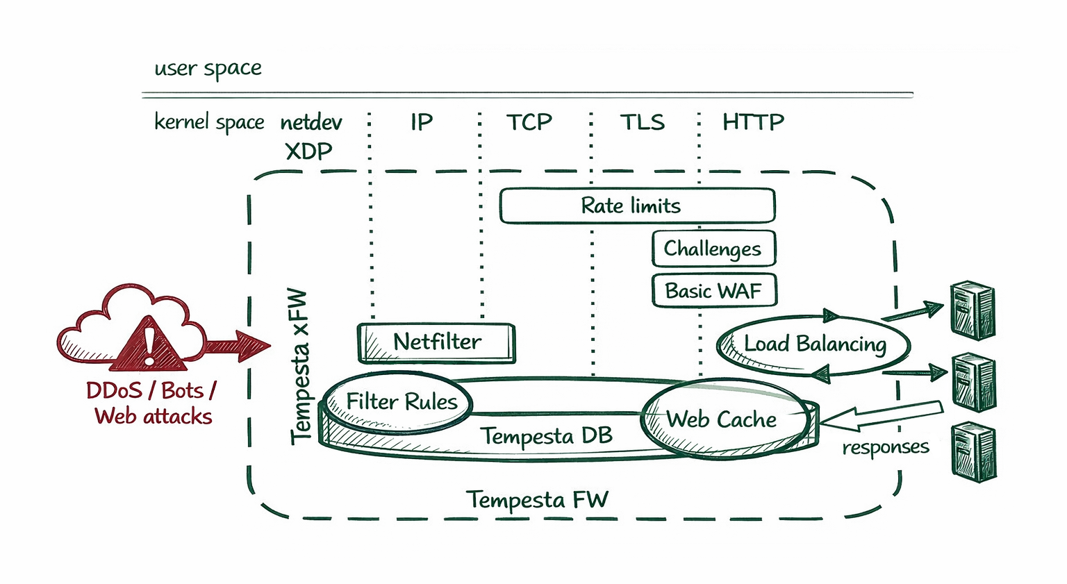 Tempesta xFW is open-source suite of Linux XDP and TC eBPF modules for volumetric DDoS protection. Its layered filtering architecture efficiently blocks both large-scale volumetric attacks and hybrid attacks.